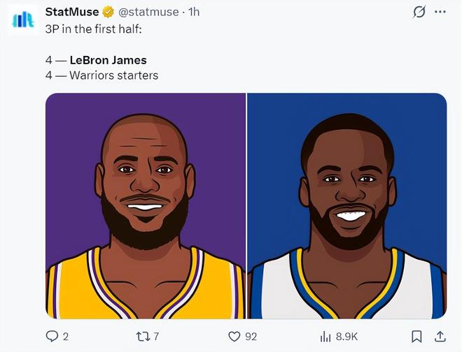 整个上半场湖人能大比分领先勇士,詹姆斯肯定是第一功劳,上半场詹姆斯17分钟,10中7,三分4中4,拿到20分4篮板4助攻1抢断,命中率70%,三分命中率100%,真实命中率88.3%,他一人命中4个三分,勇士先发5人合计4个三分。