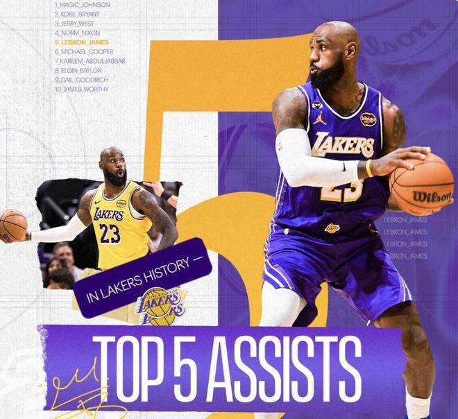 詹姆斯湖人生涯总助攻数达3669次,升至队史助攻榜第五位