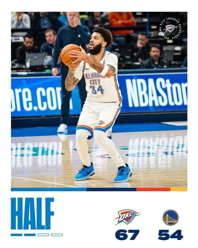 勇士队连追5分开始第二节,亚历山大三罚全中,之后的比赛两队你来我往,比分交替增加,威廉姆斯和麦卡恩又各中三分,半场前3分20秒时雷霆队以60-48领先12分。斯宾塞单打暂时止血,多尔特和亚历山大联手5分,雷霆队把优势拉开到14分。波尔津吉斯还击3分,亚历山大突破得手,半场结束时雷霆队以67-54领先13分。