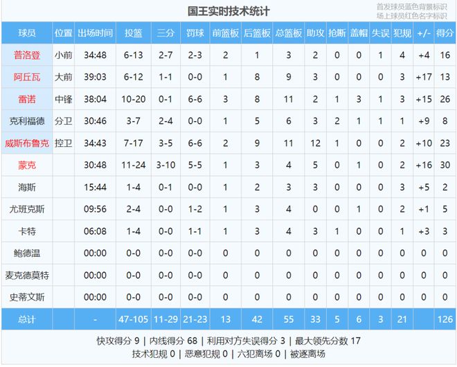 吉迪公牛生涯16次三双,超越皮蓬升至队史第二,仅次于乔丹的28次。国王后卫威少首发出战34分43秒,投篮17中7,三分5中3,罚球6中6,得到23分11篮板12助攻1抢断0失误,正负值+10。这是威少NBA生涯第208次三双!