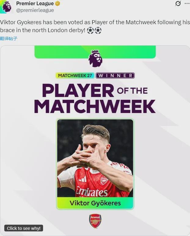 本来微主认为同样梅开二度的奥赖利更有机会拿最佳,但哲凯赖什在德比中的表现看起来更受球迷青睐!感觉已经很久没有阿森纳球员拿到英超周最佳了,恭喜哲凯!