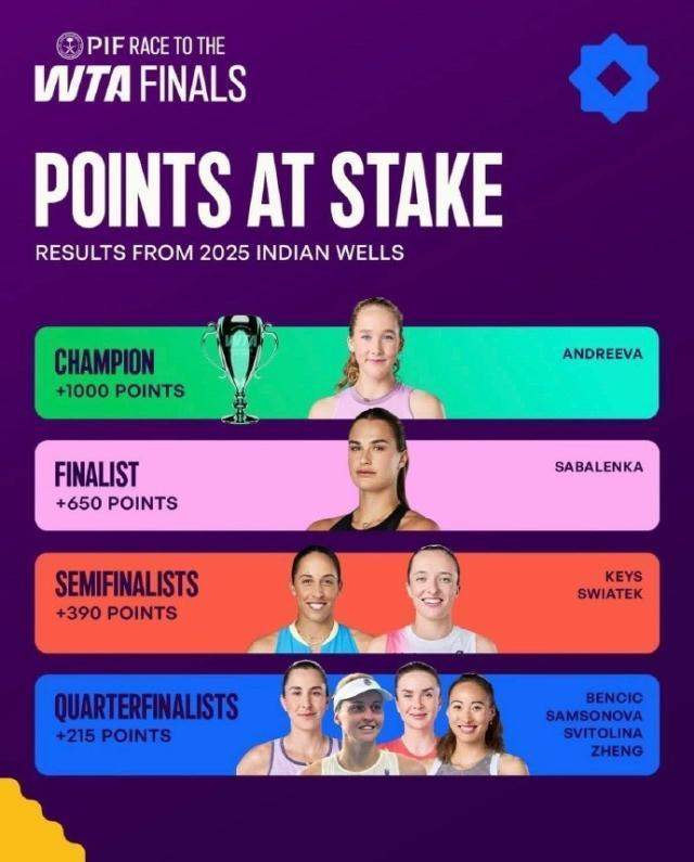 WTA1000印第安维尔斯站保分情况:郑钦文8强215分,萨巴亚军615分